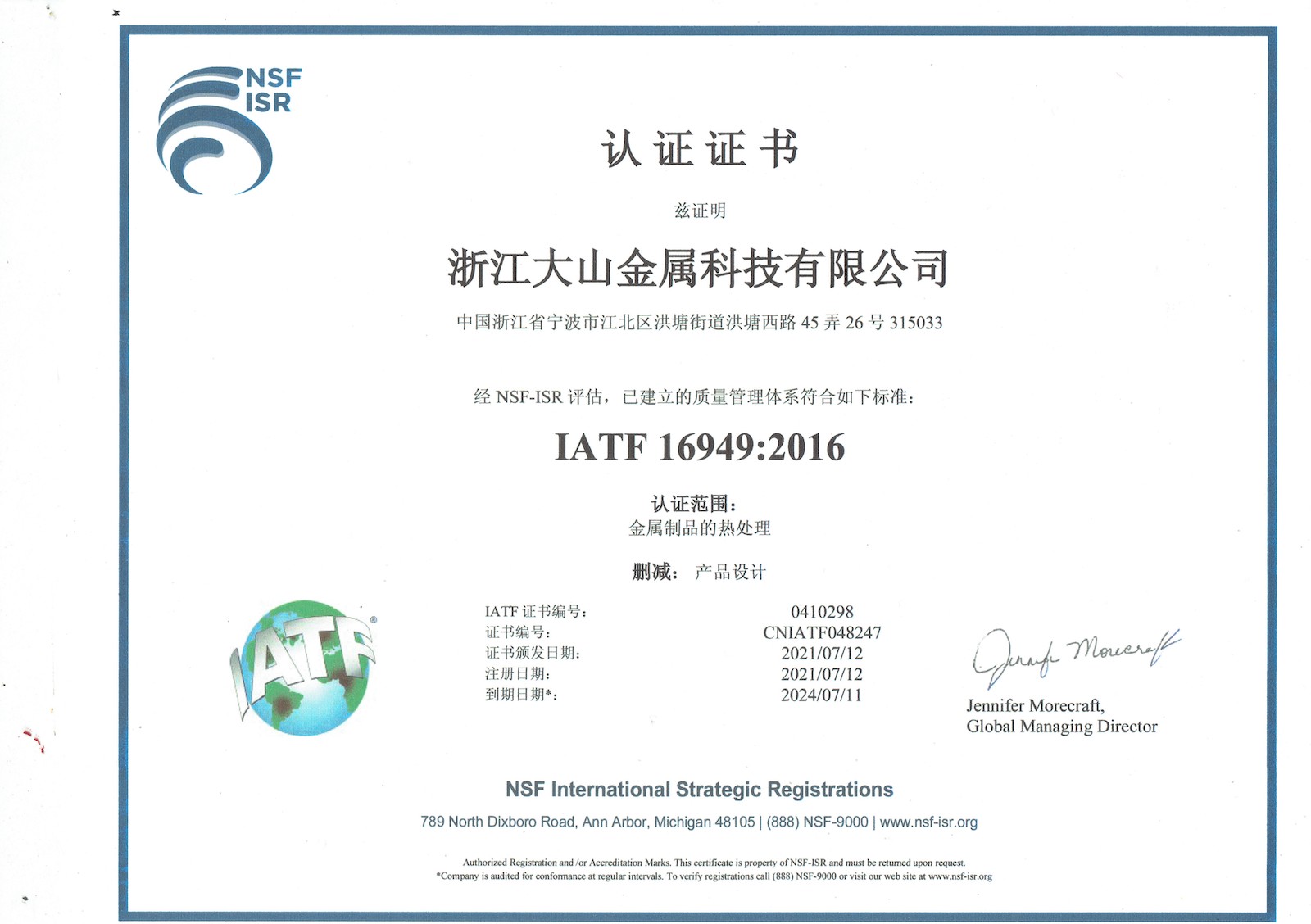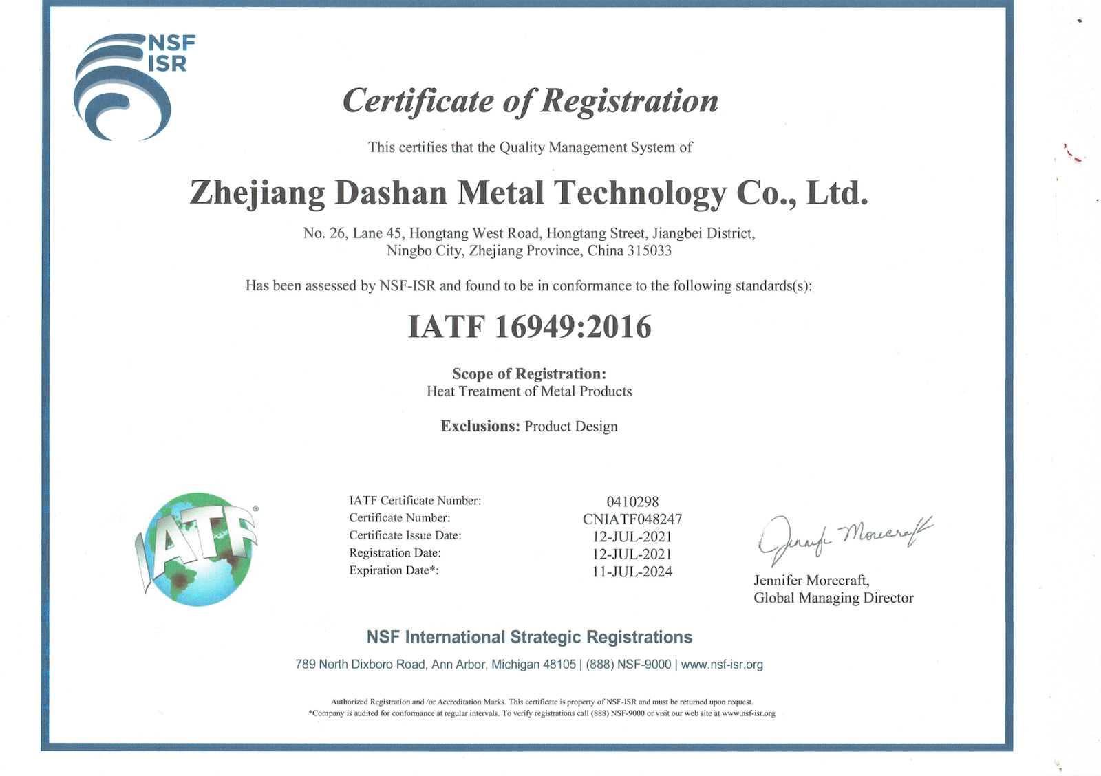 經過近35年來不斷引進先進的熱處理設備和技術,使企業具備了雄厚的產品熱處理工藝開發和生產能力,在熱處理行業中取得了令人矚目的業績,在客戶中建立了良好的口碑。本企業已通過IATF 16949:2016 質量管理體系、GB/T24001-2016 idt ISO14001:2015 環境管理體系、ISO 45001:2018 職業健康安全管理體系認證,正全面貫徹執行相關管理體系標準,為客戶提供更有保證的全面服務。大山愿與各界朋友攜手共進,為提高熱處理質量不斷努力!